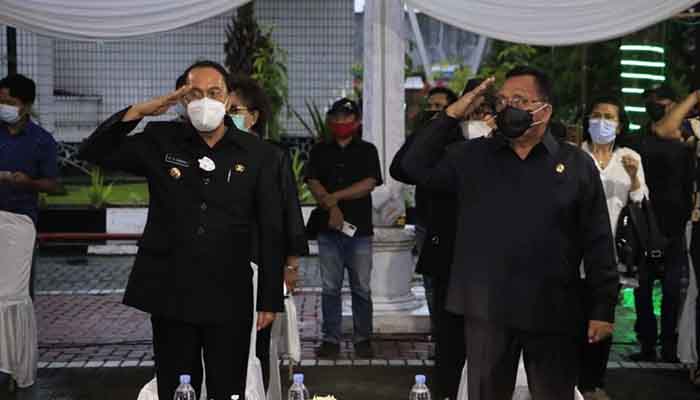 Minahasa,Sulut.siberindo.co – Bupati Minahasa Dr Ir Royke Octavian Roring MSi dan Wakil Bupati Robby Dondokambey SSi MM bersama jajaran Pemkab Minahasa menerimah jenazah Dr. Drs. Sinyo Harry Sarundajang (SHS) yang di semayamkan di Kantor Bupati Minahasa, Kamis (18/02/2021) Sore tadi.