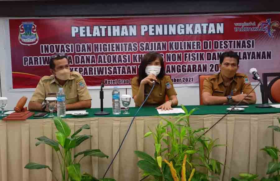 Manado – Pemerintah Kota (Pemkot) Manado melalui Dinas Pariwisata (Dispar) menggelar pelatihan peningkatan inovasi dan higienitas sajian kuliner di destinasi pariwisata, berlangsung di ruang Tarsius Granpuri Hotel, Senin (22/11/2021).