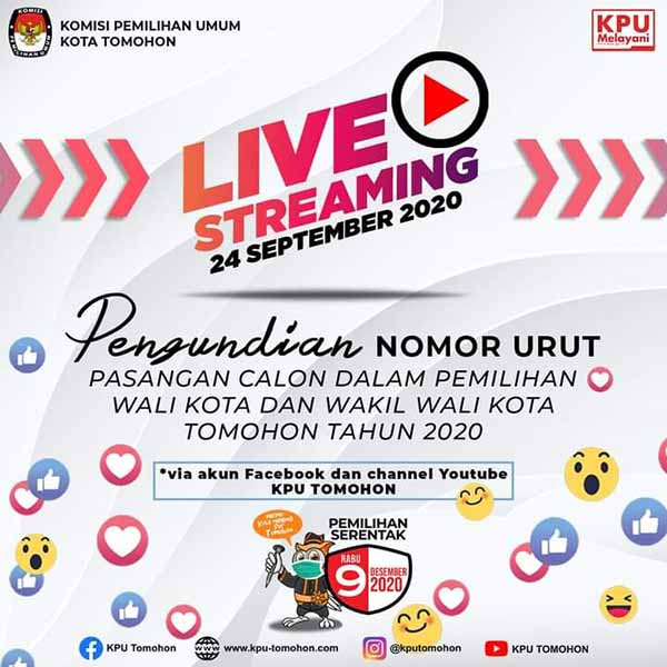 Tomohon,Sulutnews.com – Komisi Pemilihan Umum Tomohon menyampaikan karena mengingat masih dalam suasana Pandemi Covid – 19 ,maka dari itu untuk pengundian Nomor Urut Pasangan Calon dalam pemilihan Wali Kota dan Wakil Wali Kota Tomohon akan di selenggarakan hanya lewat Live Steaming,pada hari ini 24 September 2020.