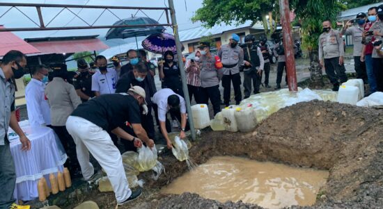 BOLMONG – Polres Bolaang Mongondow Rabu (15/09) kemarin, melakukan kegiatan pemusnahan ribuan liter Minuman Keras (Miras) dan bahan berbahaya merkuri . Kegiatan